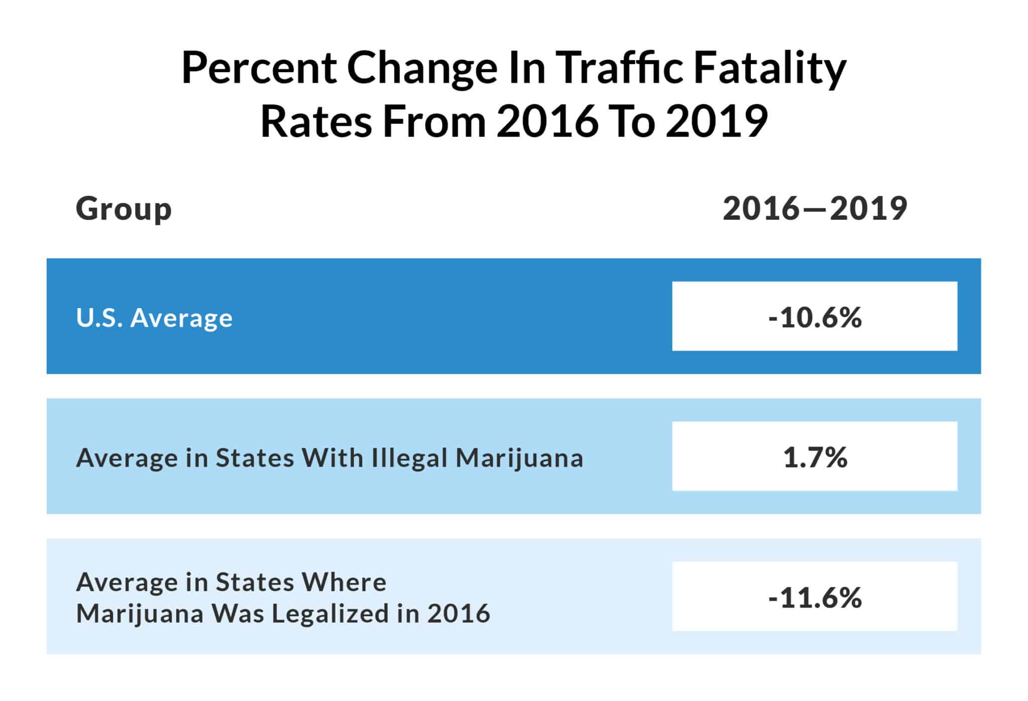 Because of this, we thought it was important to see what rates looked like with 2020 and 2021 removed from the data set. And it turns out, they look quite different. The average traffic fatality rate for the U.S. as a whole fell by 10.6% between 2016 and 2019. In states that legalized cannabis in 2016, vehicle death rates fell at a slightly higher rate of 11.6%. States that have not legalized saw a slight increase of 1.7% from 2016 to 2019.